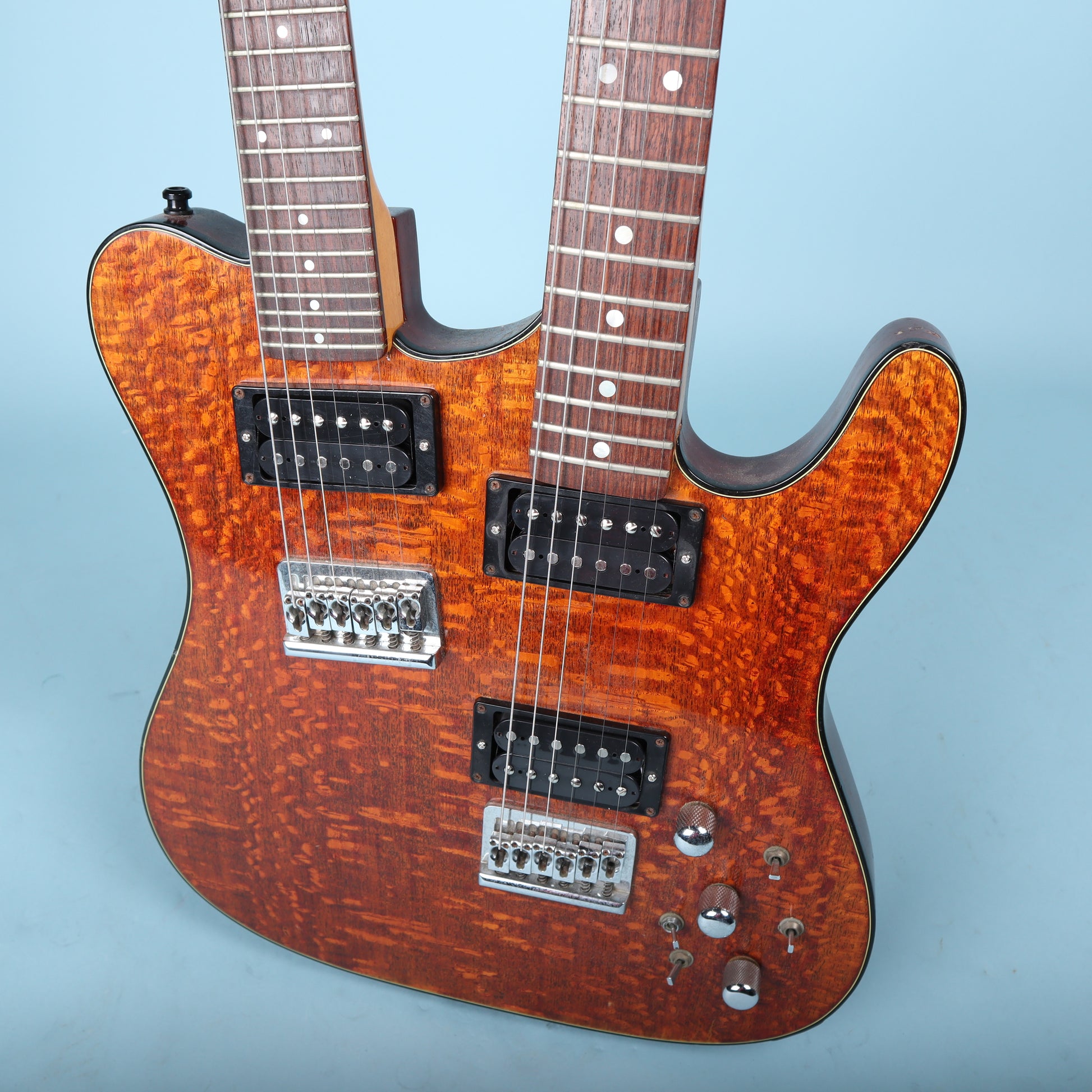 Visually, it’s a stunner. The figured top has a deep, organic grain that looks even better in person, paired with classic hardware and a layout that feels purposeful, not gimmicky. This isn’t a novelty double-neck, it’s a serious instrument built to be played.