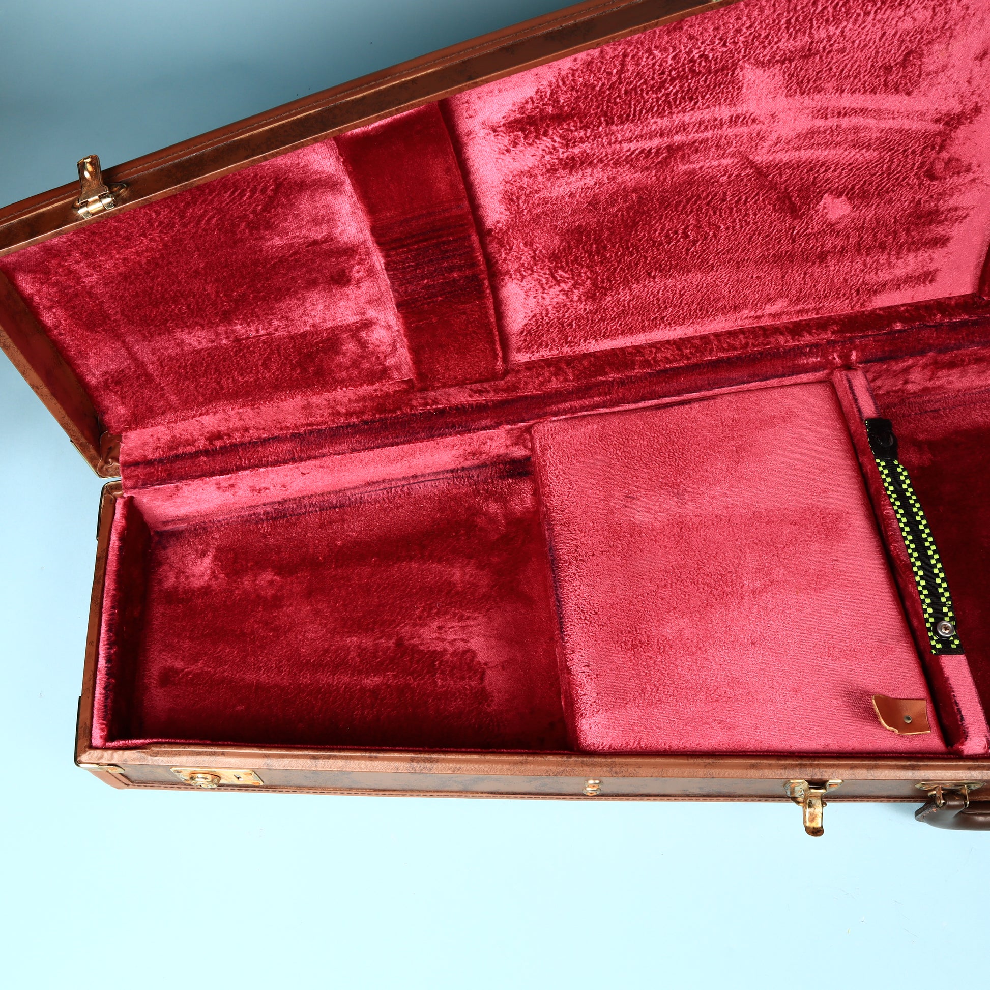 This is an authentic Gibson Custom Shop Historic Flying V case, built to the same premium standards as the guitars it was designed to protect. It features the unmistakable brown tooled leather-style exterior paired with the rich crushed red velvet interior that Gibson’s Custom Shop is known for. The fit and finish are exceptional, with high-quality brass latches, a sturdy brown leather handle, and reinforced edges that reflect Gibson’s craftsmanship.