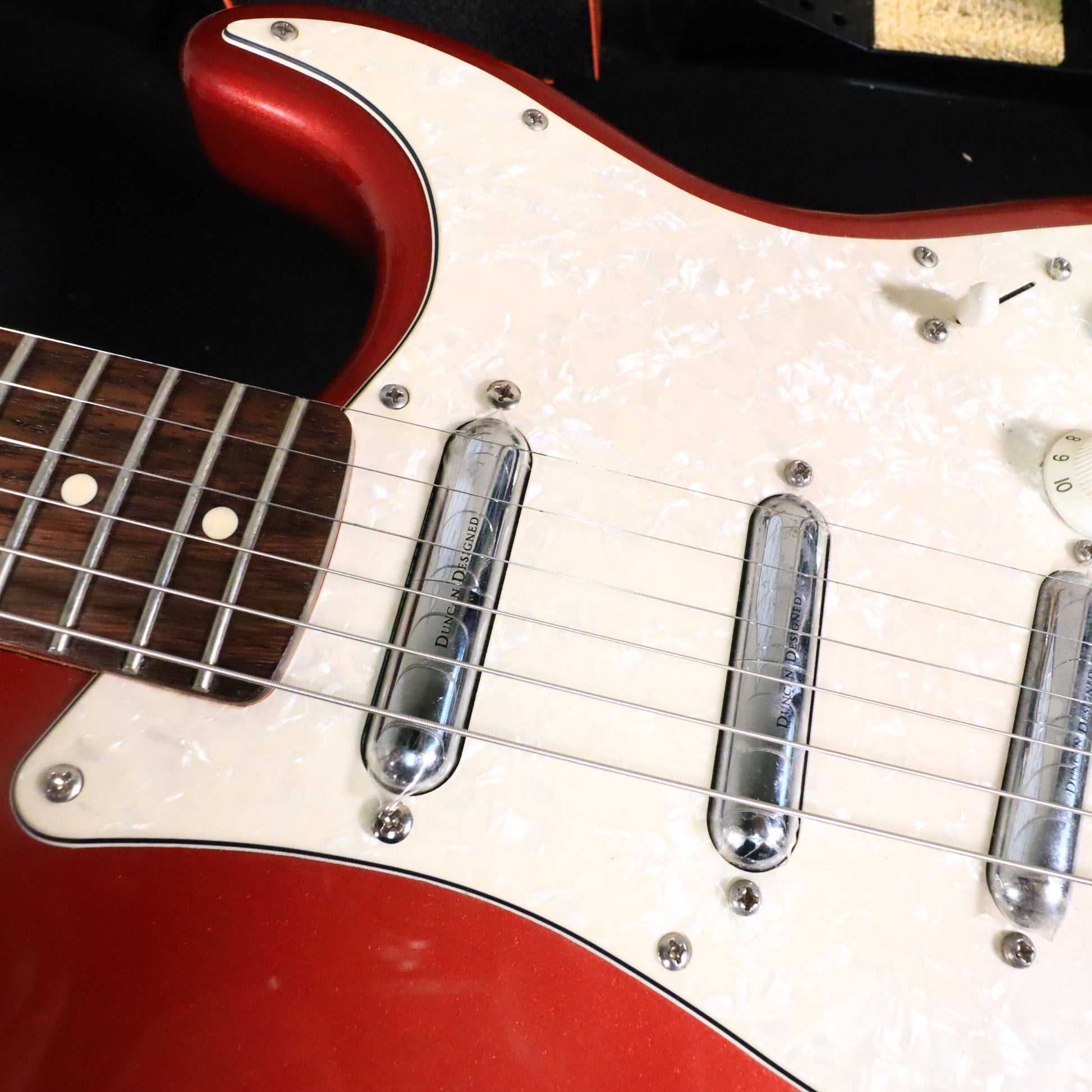 Ride the nostalgia wave with this vibrant 2013 Squier Vintage Modified Surf Stratocaster in Metallic Red—a guitar that authentically channels the spirit of 1960s surf rock. The gleaming finish and classic White Pearloid pickguard instantly transport you to the golden age of surf culture. Constructed with a lightweight basswood body and modern "C" shaped maple neck, this Strat delivers both comfort and tonal character. The rosewood fingerboard spans 21 medium jumbo frets with a 9.5" radius, making everything from smooth bends to rapid passages feel natural under your fingers. The 25.5" scale length ensures that signature bright, punchy response synonymous with classic Stratocasters. The three Duncan Designed "Lipstick" pickups are where this guitar truly shines—producing the crystalline clarity, snappy attack, and unmistakable twang that define authentic surf, blues, and funk tones. These aren't just pickups; they're your gateway to the sonic palette that shaped generations of music. This is genuine vintage character at a price that makes sense. You're getting professional construction, authentic aesthetics, and tone that inspires—without the collector's markup. Perfect for players who refuse to compromise on authenticity or playability.