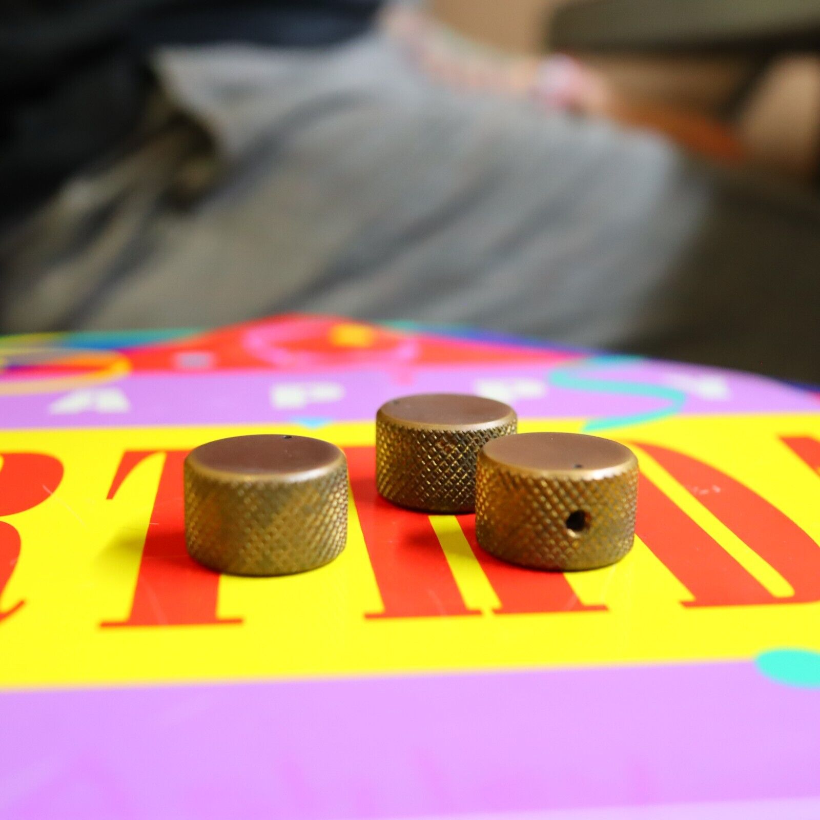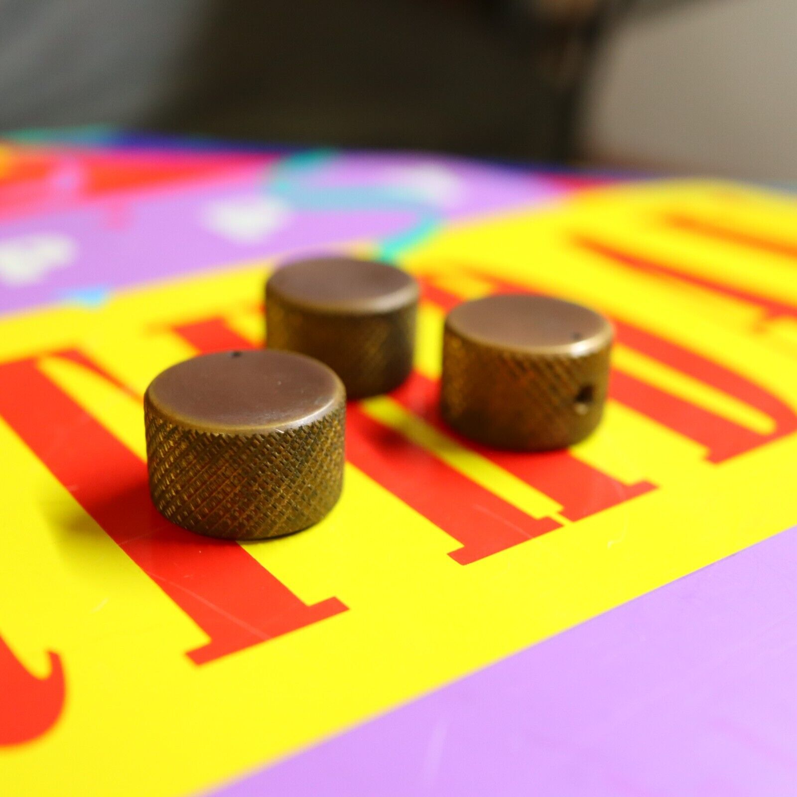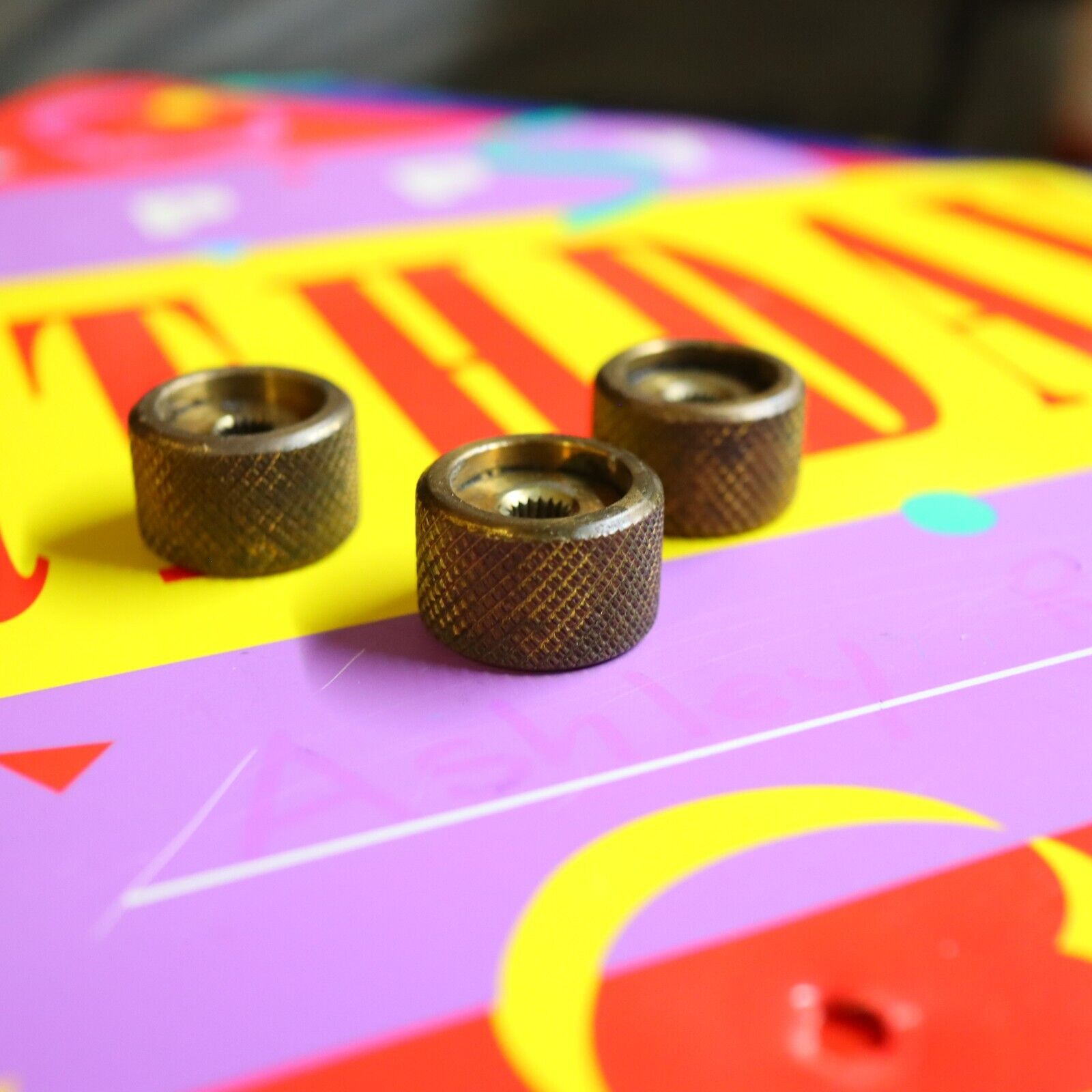 Vintage 70's 80's Knurled Brass Flat Top Split Shaft Patina Knobs w/ Set Screw
